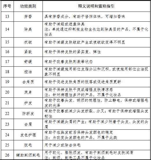 按照化妆品的功效宣称、作用部位、使用人群、产品剂型以及使用方法,《化妆品分类规则和分类目录》将化妆品从五个层次进行细分定位,并对不同的划分进行编号。 需要注册/备案的化妆品根据不同功效、作用部位等以上五个层次,依次选择对应序号,各组目录编码之间用“-”进行连接,形成完整的产品分类编码。 在功效宣称目录方面,《化妆品分类规则和分类目录》将化妆品的功效分为了染发、烫发、祛斑美白、防晒、防脱发、祛痘、滋养、修护、清洁、卸妆、保湿、美容修饰、芳香、除臭、抗皱、紧致、舒缓、控油、去角质、爽身、护发、防断发、去屑、发色护理、脱毛、辅助剃须剃毛,共26类。 与之前《化妆品分类规则和分类目录》征求意见稿中出现的功效类型相比,去掉了“毛发造型”一类,同时将“祛斑美白”“祛斑美白(仅物理遮盖)”两类合成“祛斑美白”一类,该功效指有助于减轻或减缓皮肤色素沉着,达到皮肤美白增白效果;通过物理遮盖形式达到皮肤美白增白效果(含改善因色素沉积导致痘印的产品)。