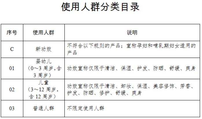 ![]() 在产品剂型方面,冻干粉、冻干片等冻干类剂型也出现在11种规定剂型之列。化妆品的主要产品剂型包括膏霜乳、液体、凝胶、粉剂、块状、泥、蜡基、喷雾剂、气雾剂、贴、膜、含基材等。 此外,在使用人群的划分上,《化妆品分类规则和分类目录》将人群分为婴幼儿(0~3周岁,含3周岁)、儿童(3~12周岁,含12周岁)以及普通人群。对于前两类,化妆品在功效宣称上还有不同的规定。其中,婴幼儿化妆产品,功效宣称仅限于清洁、保湿、护发、防晒、舒缓、爽身;儿童化妆产品,功效宣称仅限于清洁、卸妆、保湿、美容修饰、芳香、护发、防晒、修护、舒缓、爽身。另外,宣称孕妇和哺乳期妇女适用的化妆品要按照特殊化妆品注册管理。 ![]() 值得注意的是,如果同一产品具有多种功效宣称、作用部位、使用人群或者产品剂型的,可选择多个对应序号,各序号应当按顺序依次排列,序号之间用“/”进行连接。 此外,《化妆品分类规则和分类目录》显示,对于2021年5月1日前已经取得注册或者完成备案的化妆品,化妆品注册人、备案人应当于2022年5月1日前,通过化妆品注册备案信息服务平台补充提供产品分类编码。