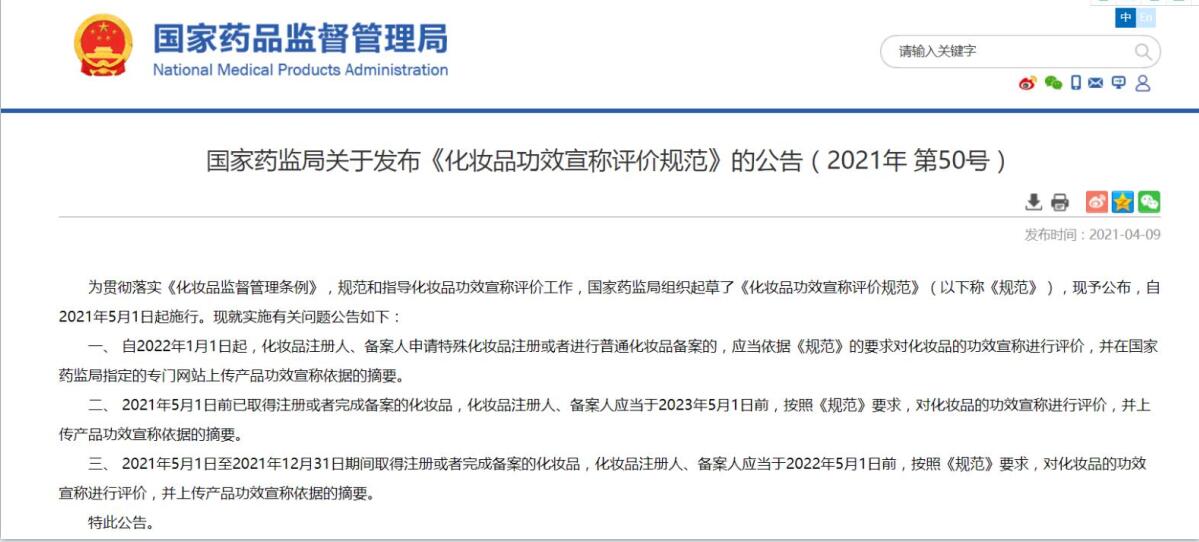 4月9日,国家药品监督管理局发布《化妆品分类规则和分类目录》《化妆品功效宣称评价规范》《化妆品安全评估技术导则(2021年版)》3则重要通告。 ![]() 作为新《化妆品监管管理条例》的配套法案,这三则通告就化妆品的分类规则、功效宣称评价及安全评估技术标准做了详细具体的规范,并规定5月1日起正式施行。